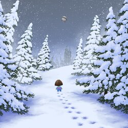 always love to draw forests in winter. frisk trudges through the snows of snowdin.... or possibly the snows of winters from earthbound as the sky runner swoops overhead....