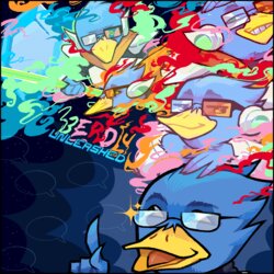 "How many times can this guy draw Berdly?" At least once more. — I was deeply inspired by a YouTube speedpaint titled KYARY by HEARTMUSH, depicting wacky music video personas bursting from a singer's brain. Combining that with Berdly's patented Expressions™ really invokes a self-aggrandizing explosion of ego. Thank you to my fellow artists for picking the final version of the "UNLEASHED" text & thank you to my MacK for cautioning me against using fart green for the clouds.