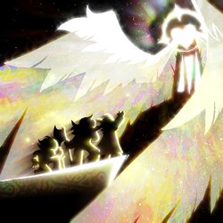 At first, my idea with this track art was going to be something basic. Just an image of the Delta Rune (with a heart replacing the Angel's circle) and the Fun Gang reaching towards it. Even though it didn't really work out, I thought the idea of the Angel with a SOUL at its center would be a really potent symbol. In Chapter 4, this scene really got to me. Sure, the player has ostensibly been helping Kris, Susie and Ralsei on their quest this whole time, but you're practically just a passive voyeur to their adventure. During this scene, however, you're a part of the group. You're lighting the way. You're a beacon of hope. You're their guardian angel.