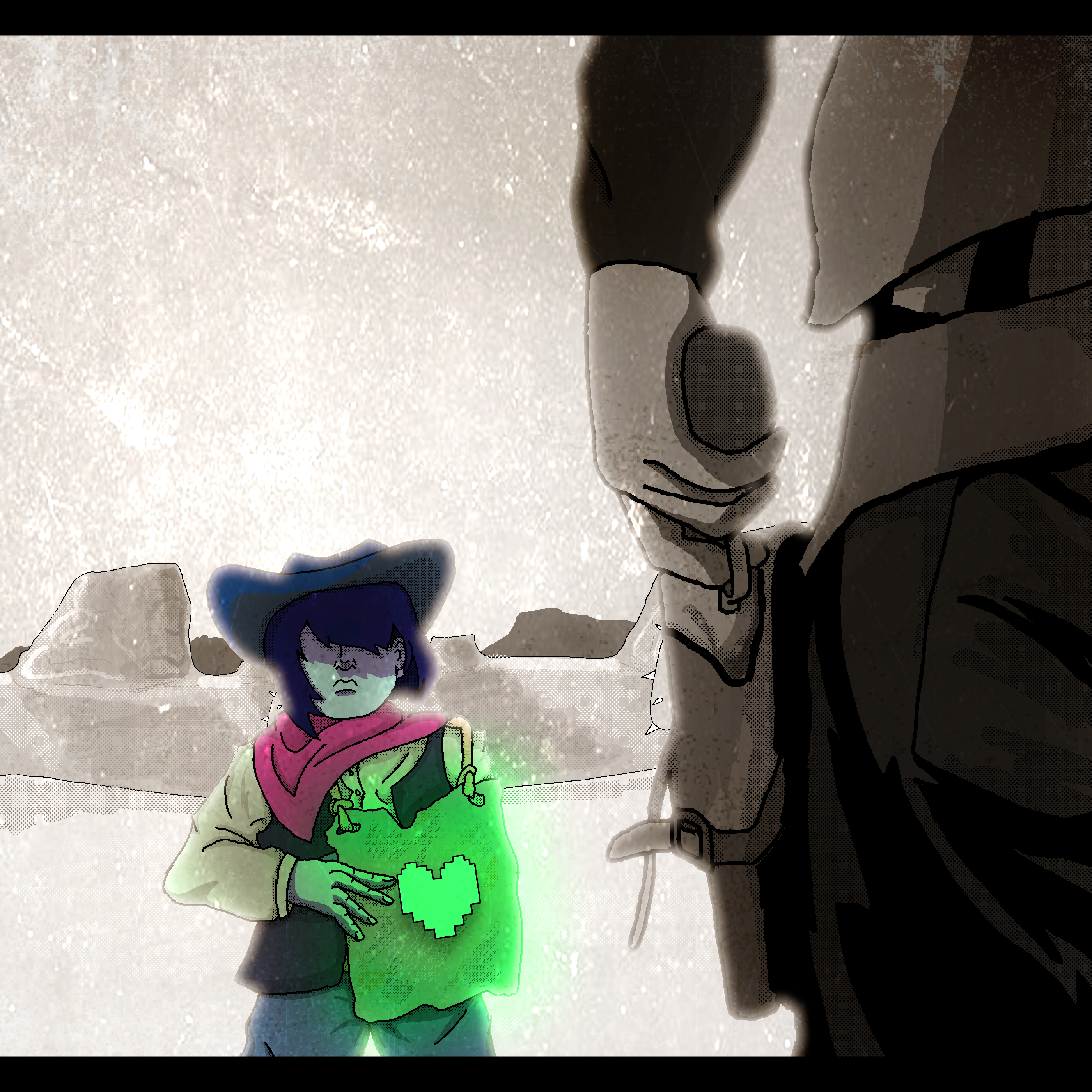 There is a friend contained within me. My idea for this artwork was inspired by A Fistfull of Dollars, specifically the scene where Clint Eastwood's character has a bullet proof vest fashioned out of a sheet of metal. I did something similar, but also tied that to the green soul with it's shielding aspect.