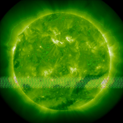 a databent image of the green sun, with some morse code spelling out HELP ME in it