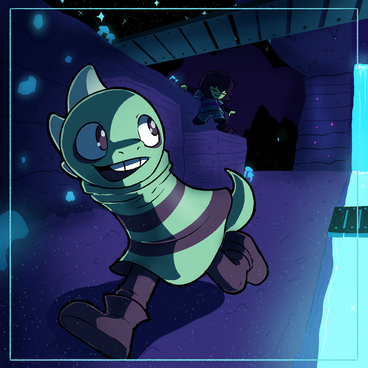 Frisk and Monster Kid playing at the waterfall!